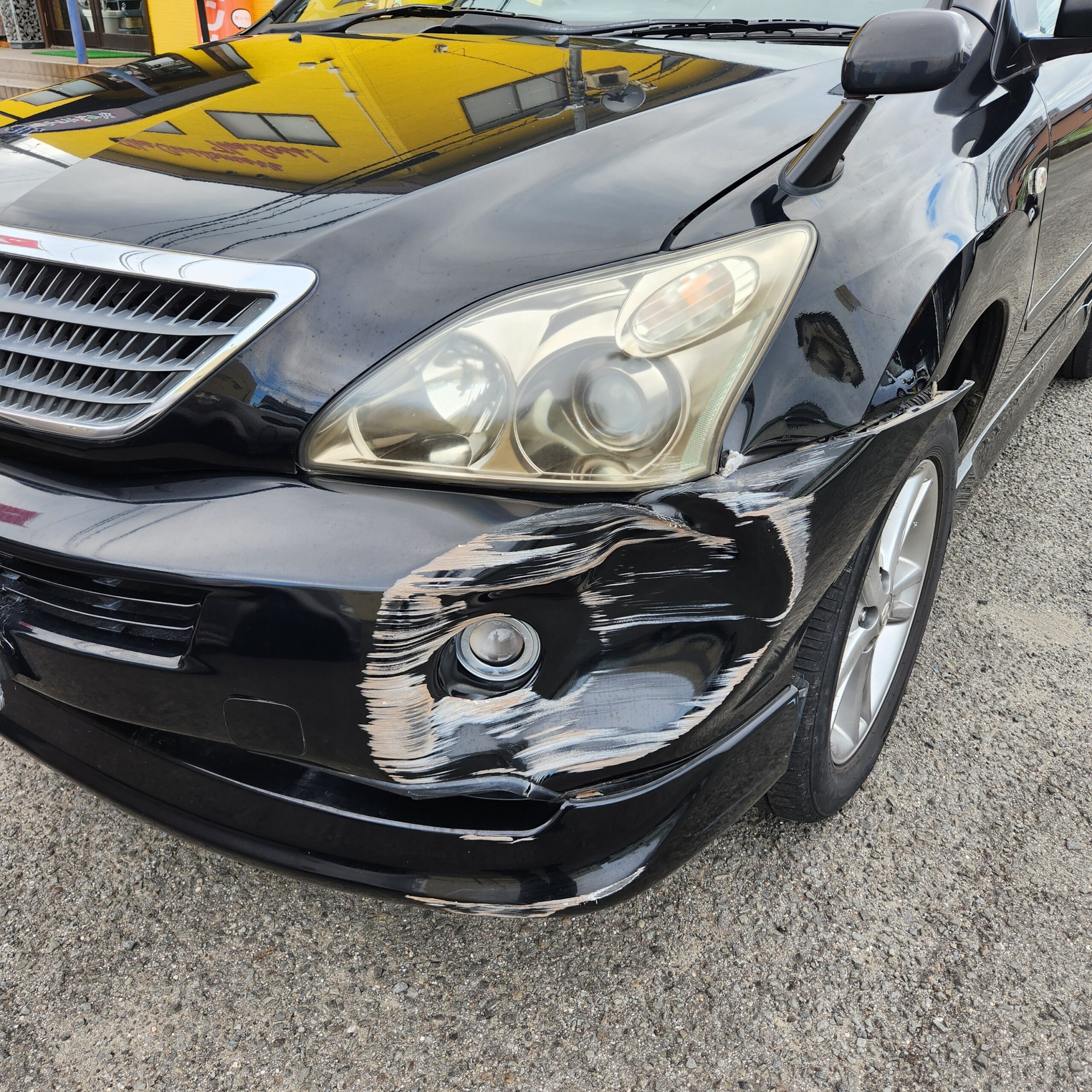 左前バンパーはべっこりヘコみ