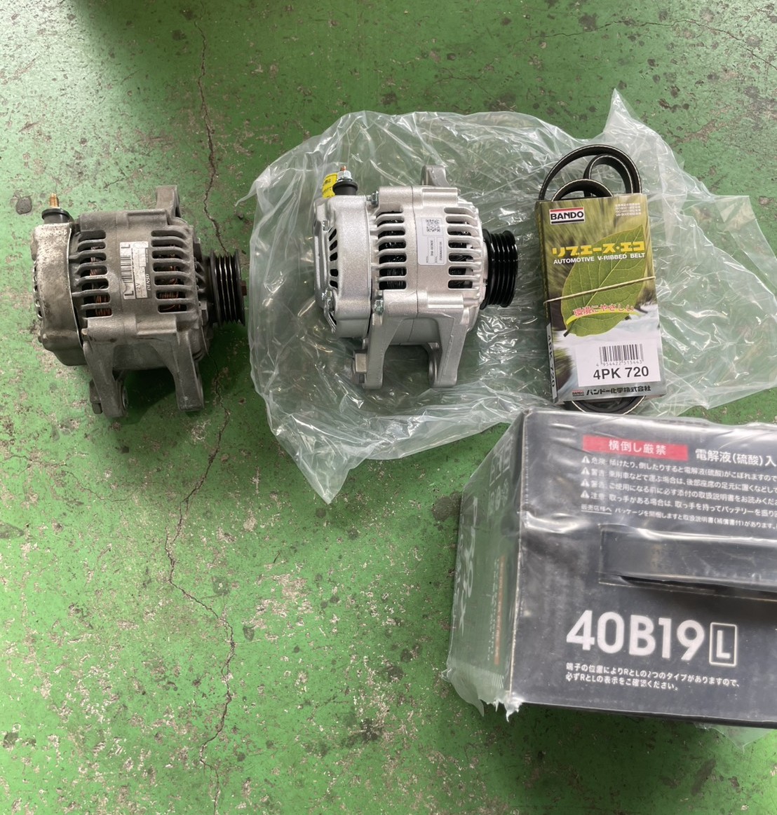 今回交換した部品、オルタネーター(リビルト)、バッテリー、ファンベルト・エアコンベルトです。