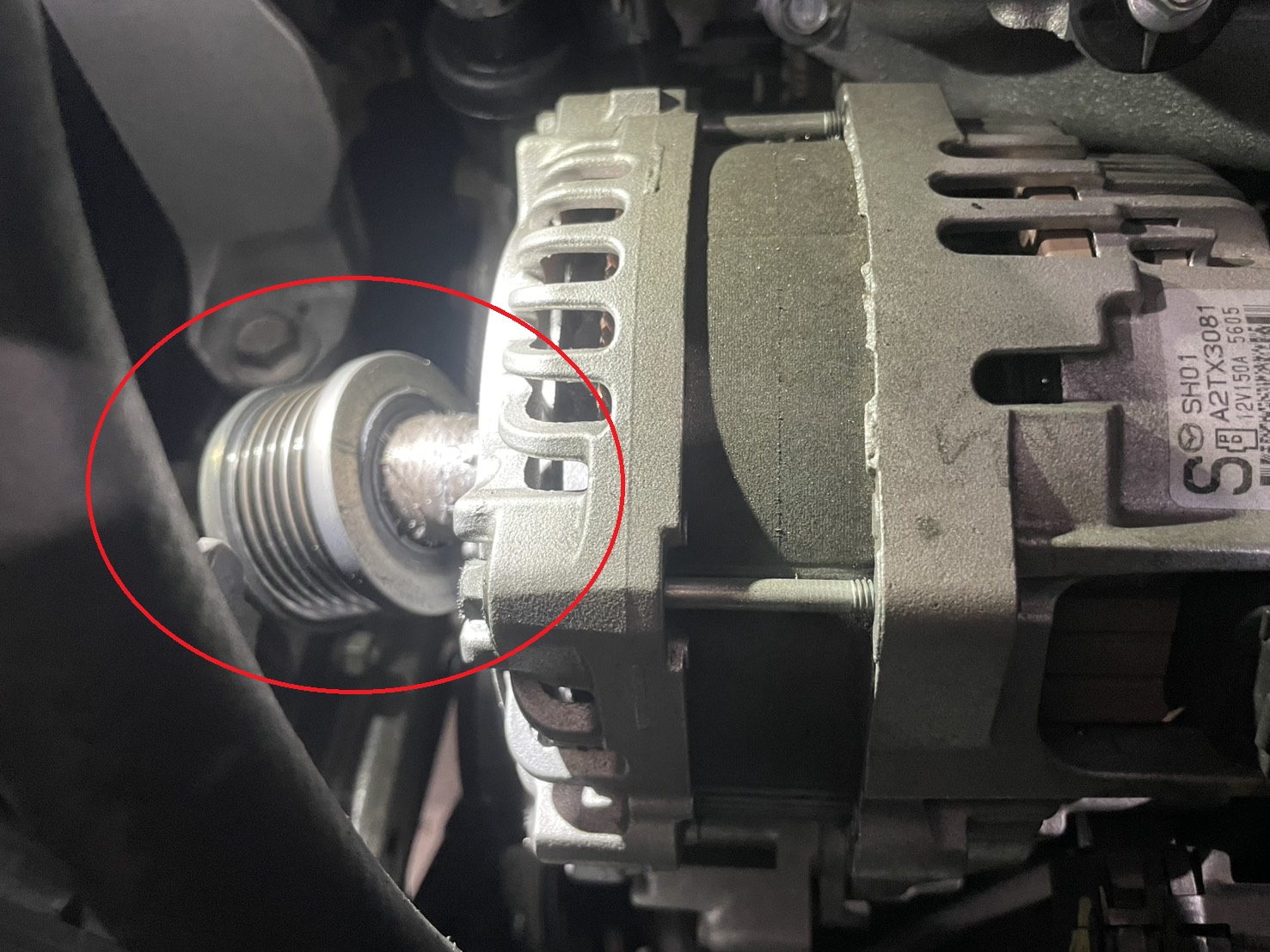 オルタネーターのプーリーが外れかけていて